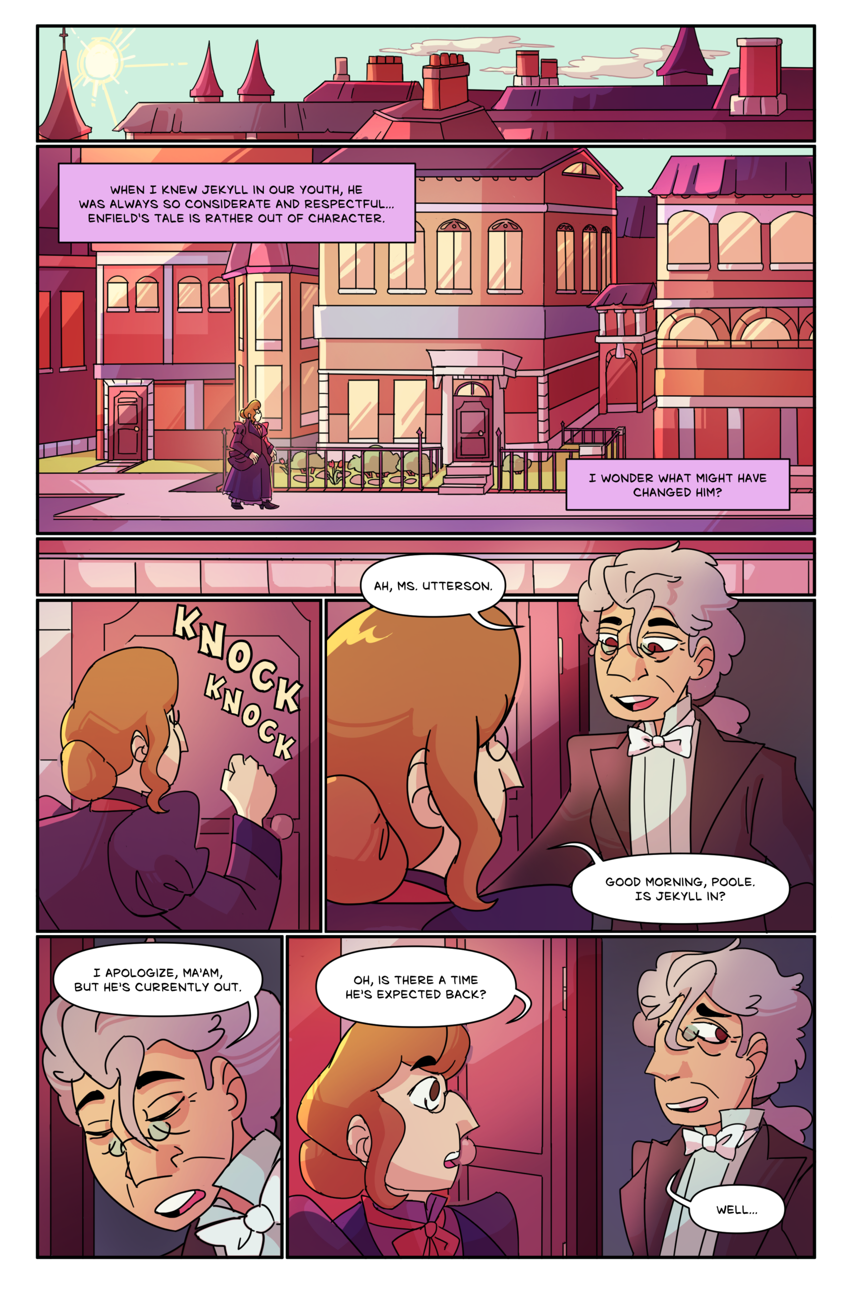 That being said, Poole! She’s genderbent like Utterson, though I realize her pronouns might not show up in this comic. So to clarify: Poole’s a woman. She’s in the traditionally male occupation of butler because Jekyll chose to promote an experienced member of his staff over hiring some new guy. A decision that I’m pleased to report, is based on an actual account of the past!